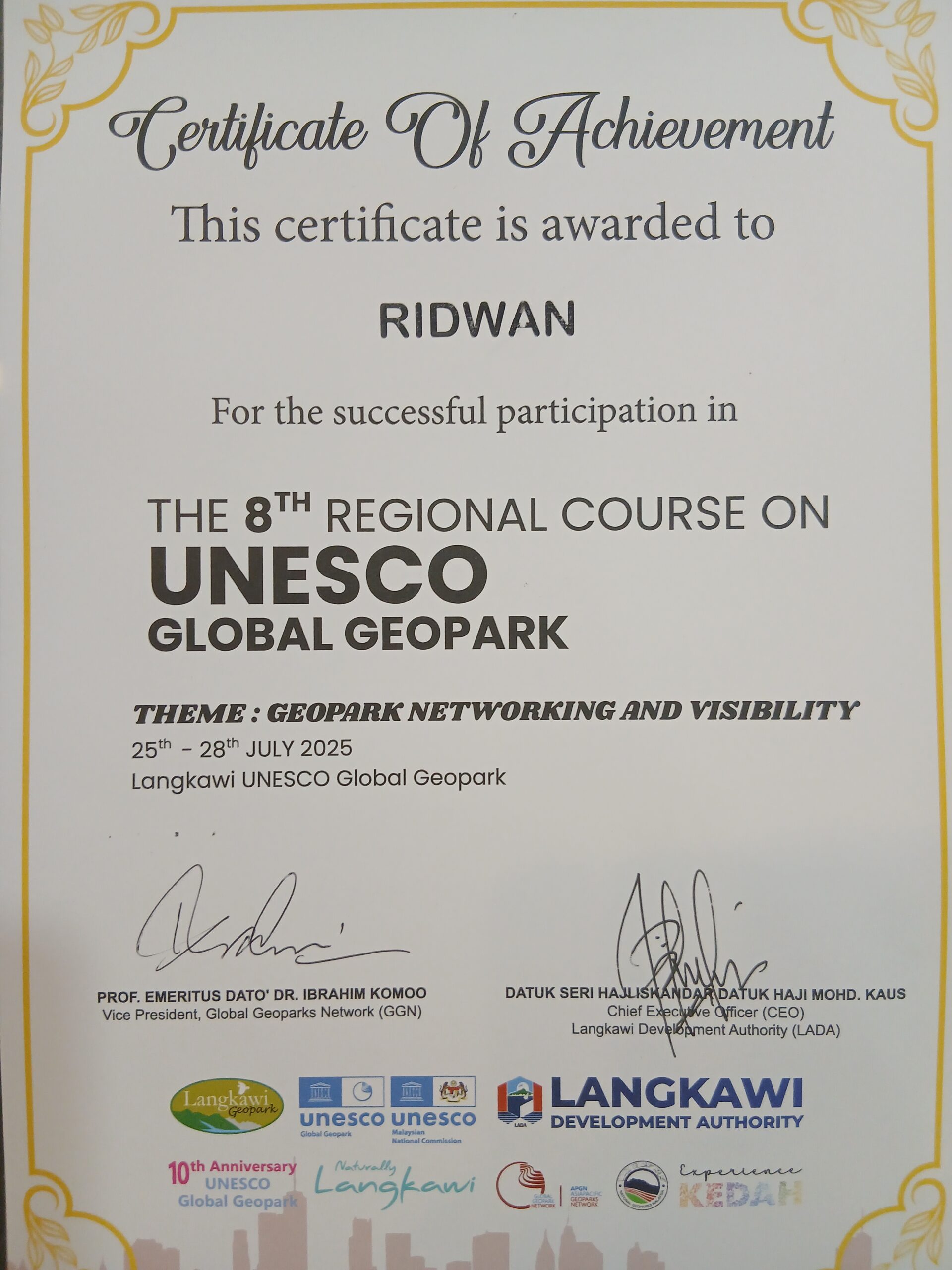 Sign in Welcome! Log into your account your username your password Forgot your password? Get help Password recovery Recover your password your email A password will be e-mailed to you. REGIONAL COURSE ON UNESCO GLOBAL GEOPARK 25 July 2025 Author: Bp-Geopark Ranah Minang Silokek Category: EDUCATION Share Facebook Twitter Pinterest WhatsApp REGIONAL COURSE ON UNESCO GLOBAL GEOPARK 25-28 JULY 2025 Bp-Geopark Ranah Minang Silokek Read More Related Articles Geotourism Geotourism Geotourism Geotourism CELEBRATING INTERNATIONAL GEODIVERSITY DAY 2025 CELEBRATING WORLD TOURISM DAY 2025