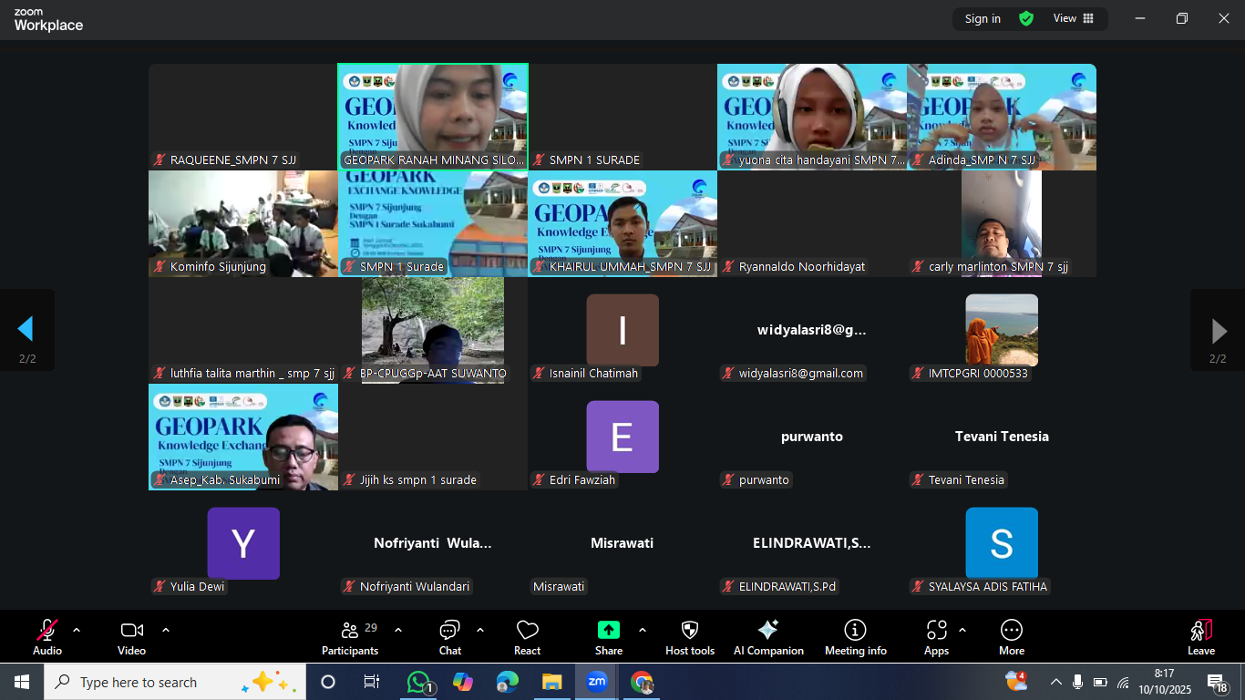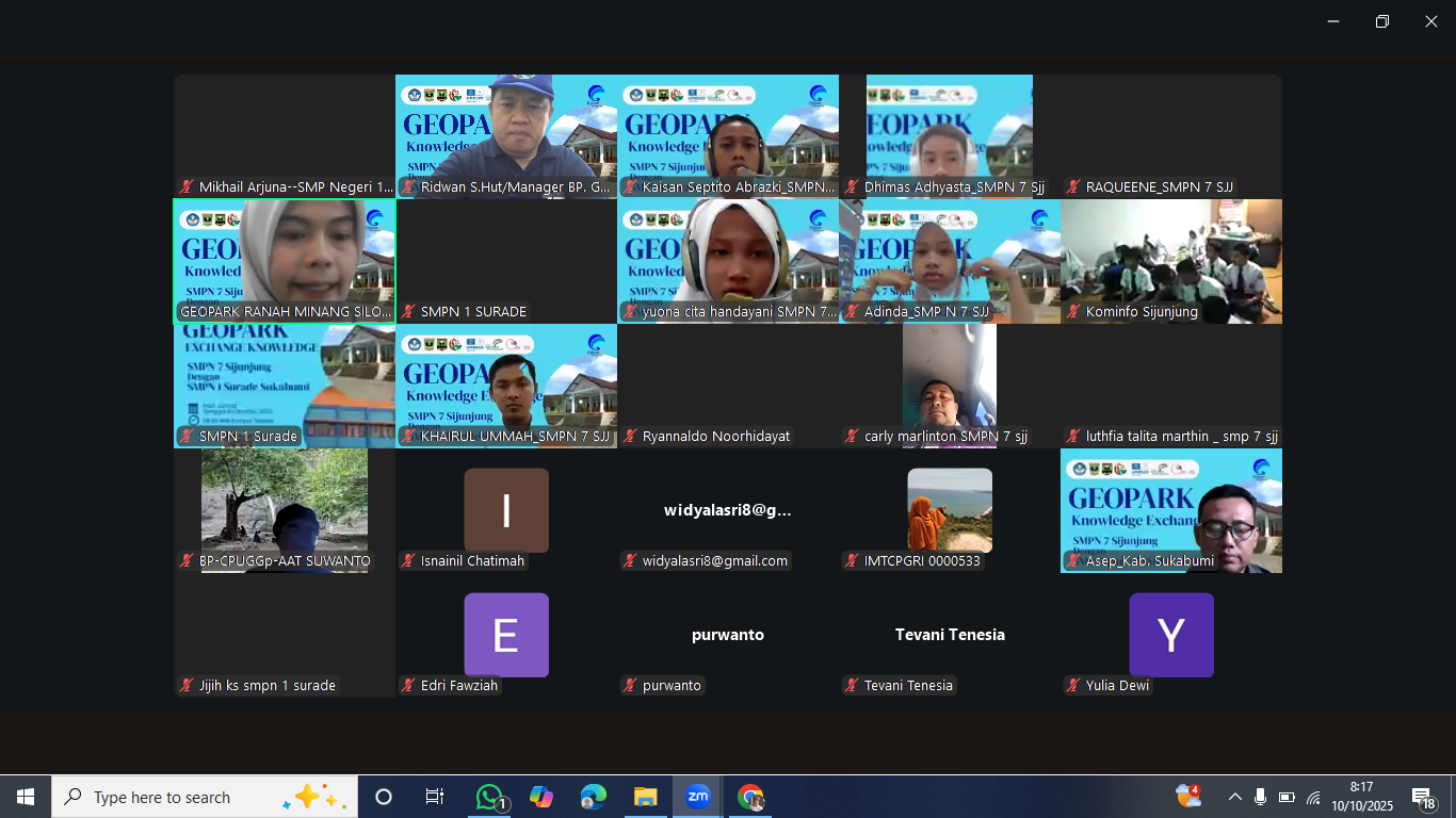 Sign in Welcome! Log into your account your username your password Forgot your password? Get help Password recovery Recover your password your email A password will be e-mailed to you. Education 11 October 2025 Author: Bp-Geopark Ranah Minang Silokek Category: EDUCATION Share Facebook Twitter Pinterest WhatsApp Kegiatan Pertukaran Pengetahuan tentang Geopark antara SMPN 7 Sijunjung dengan SMPN 1 Surade Sukabumi yang dilaksanakan melalui Daring pada tanggal 10 Oktober 2025 dilakukan dalam rangka meningkatkan pengetahuan para pelajar terkait geopark. Bp-Geopark Ranah Minang Silokek Read More Related Articles CELEBRATING INTERNATIONAL DAY FOR DISASTER RISK REDUCTION EDUCATION Education NETWORKING Networking With Riau University Geotourism Geotourism